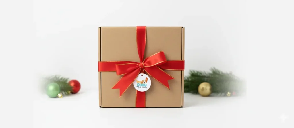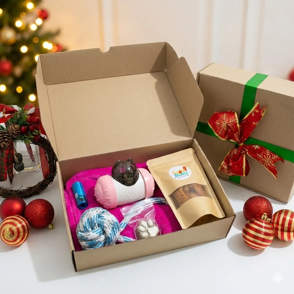 Nuestra Caja Navideña incluye un juguete interactivo tipo dispensador, un juguete de cuerda resistente ideal para masticadores potentes, snacks naturales, bolsitas para paseo y un detalle navideño que hace la experiencia aún más especial.